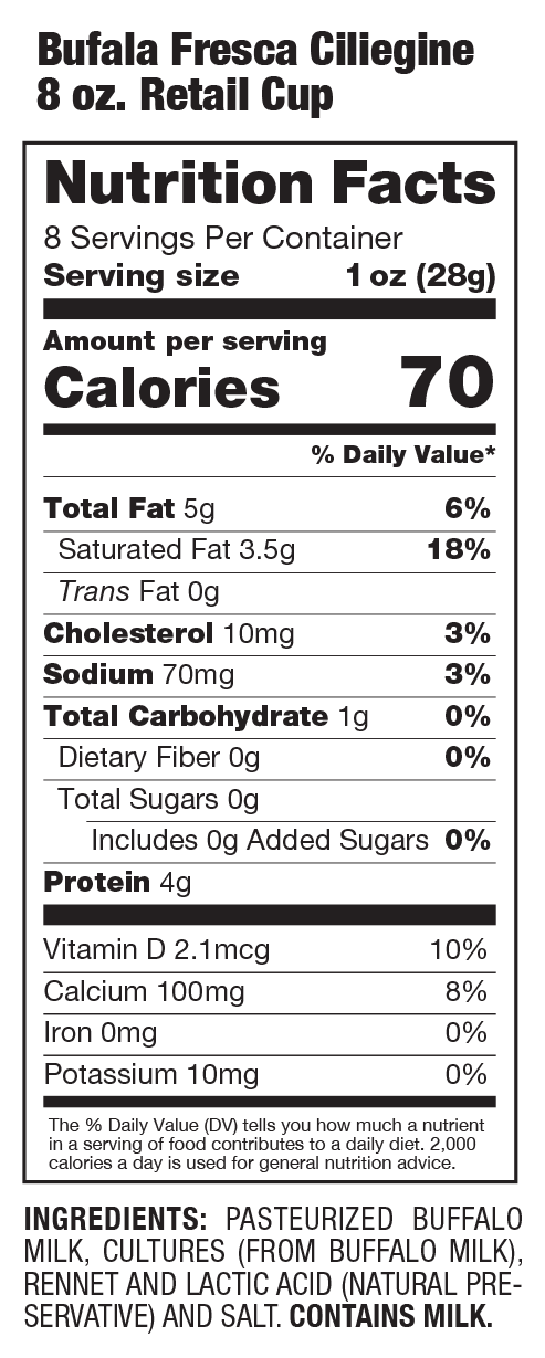 Made with 100% grass-fed buffalo milk imported from Italy, this all natural Bufala Fresca unveils an alluringly distinctive flavor with a deliciously creamy texture. Savor the inspirational essence of Italy’s original Mozzarella di Bufala made here in the U.S.A.